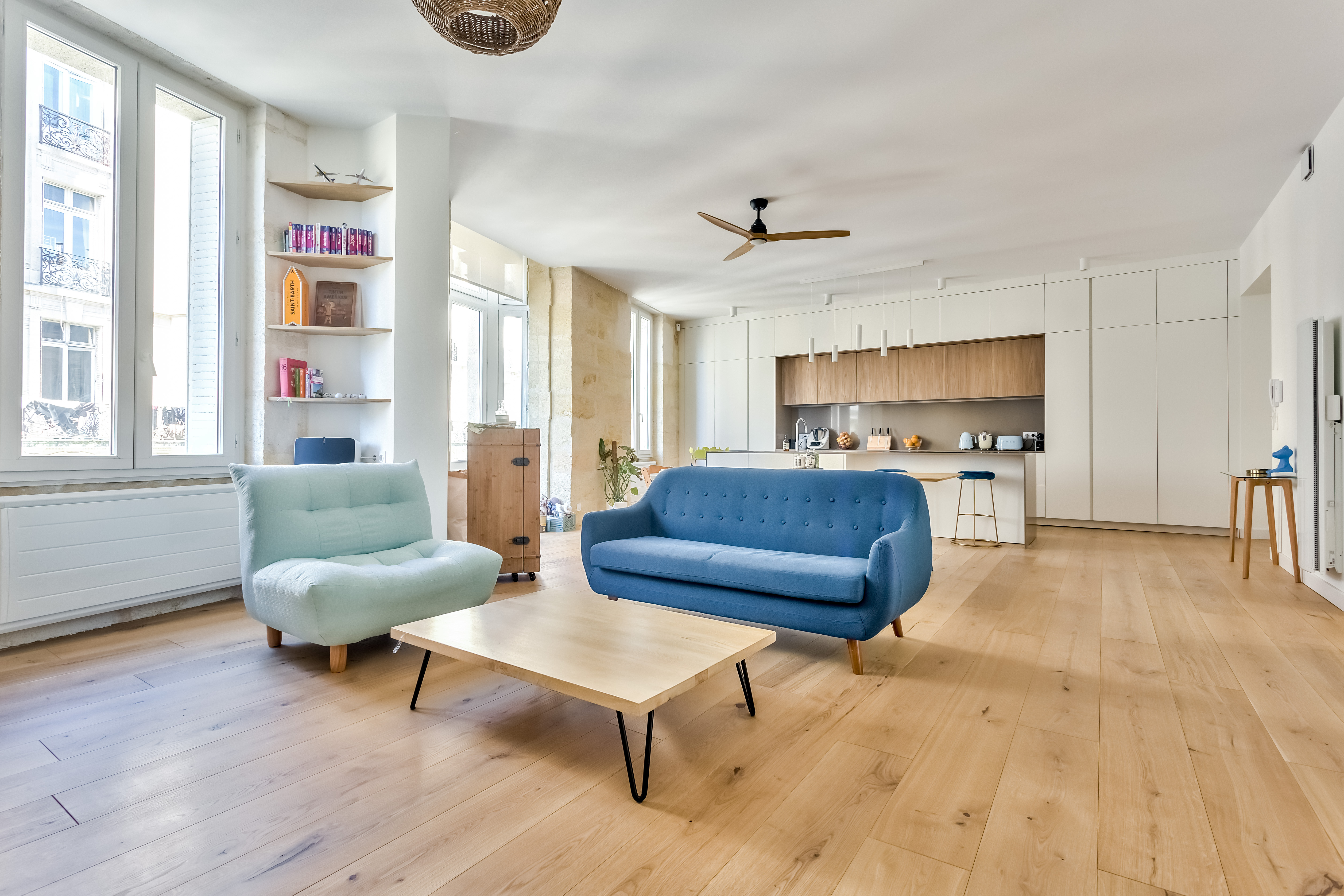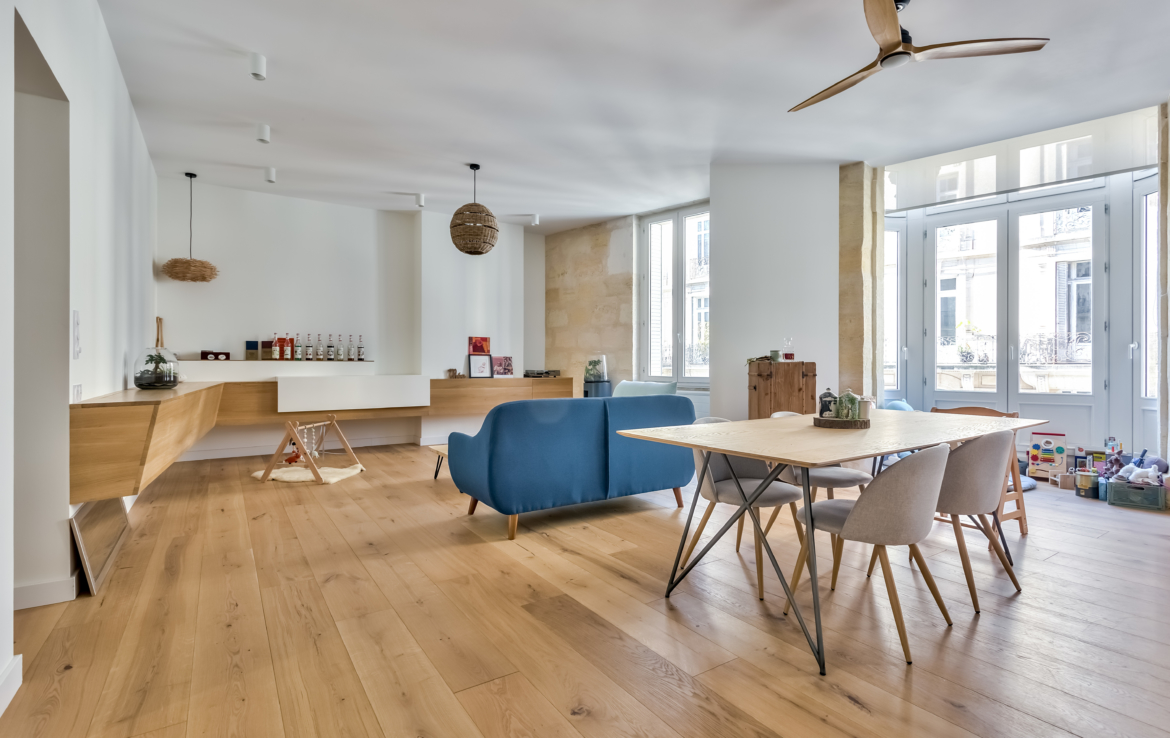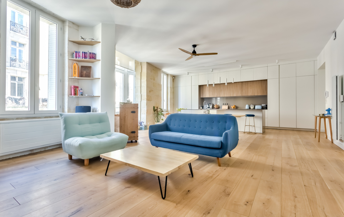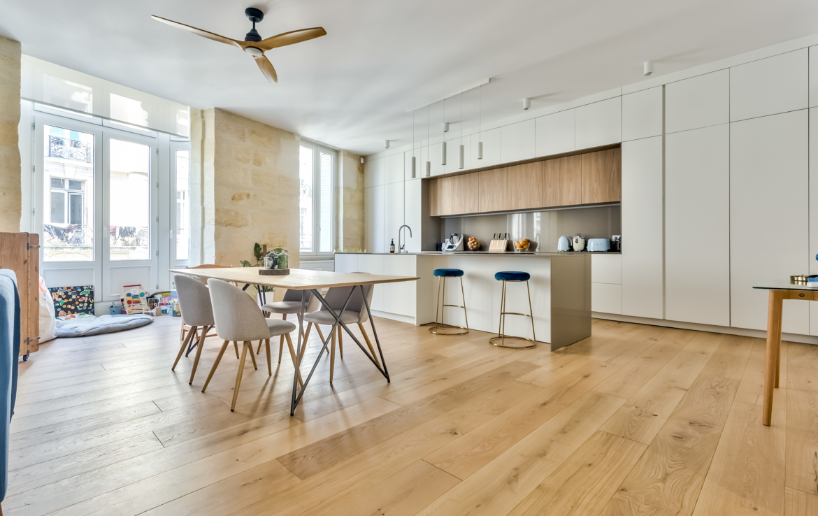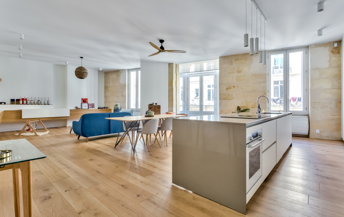 Bordeaux Centre – Nous vous proposons ce très bel appartement entièrement rénové d’une surface de 108,23m² Loi Carrez au deuxième étage d’un très immeuble en pierre en très bon état. Ce bien au style épuré se compose d’une grande pièce de vie de 65m² benéficiant d’une cuisine aménagée et équipée avec un bel espace dinatoire et offrant un salon spacieux. Vous trouverez une première chambre de 20m² bénéficiant d’un dressing et d’une salle de bain privative. Un second espace nuit séparé propose une deuxième chambre avec sa salle d’eau privative et de grands placards aménagés. Beaux volumes, nombreux rangements, matériaux de qualité. Chauffage individuel avec radiateurs à inertie. Une cave complète ce bien. L’immeuble ainsi que les parties communes sont en parfait état. Aucuns travaux de copropriété à prévoir. A proximité des commerces et du Tramway (1 minute à pied).