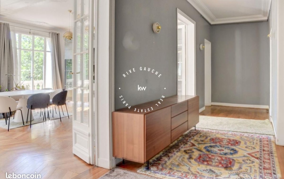 Ce bien de prestige, traversant et exposé sud, propose une vaste entrée, un séjour de plus de 46 m², une cuisine ouverte intégralement équipée, trois chambres, deux salles de bains dont une avec wc, un wc séparé et un dressing.