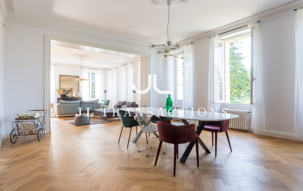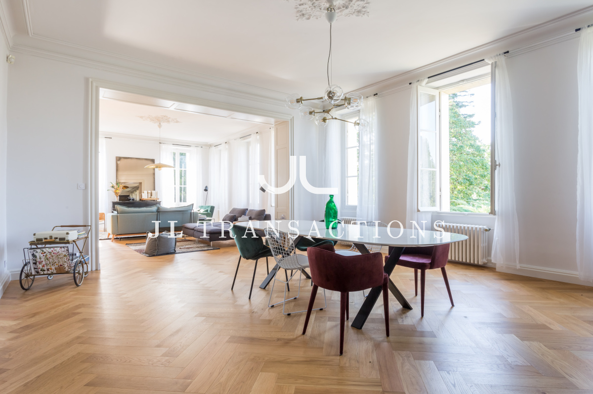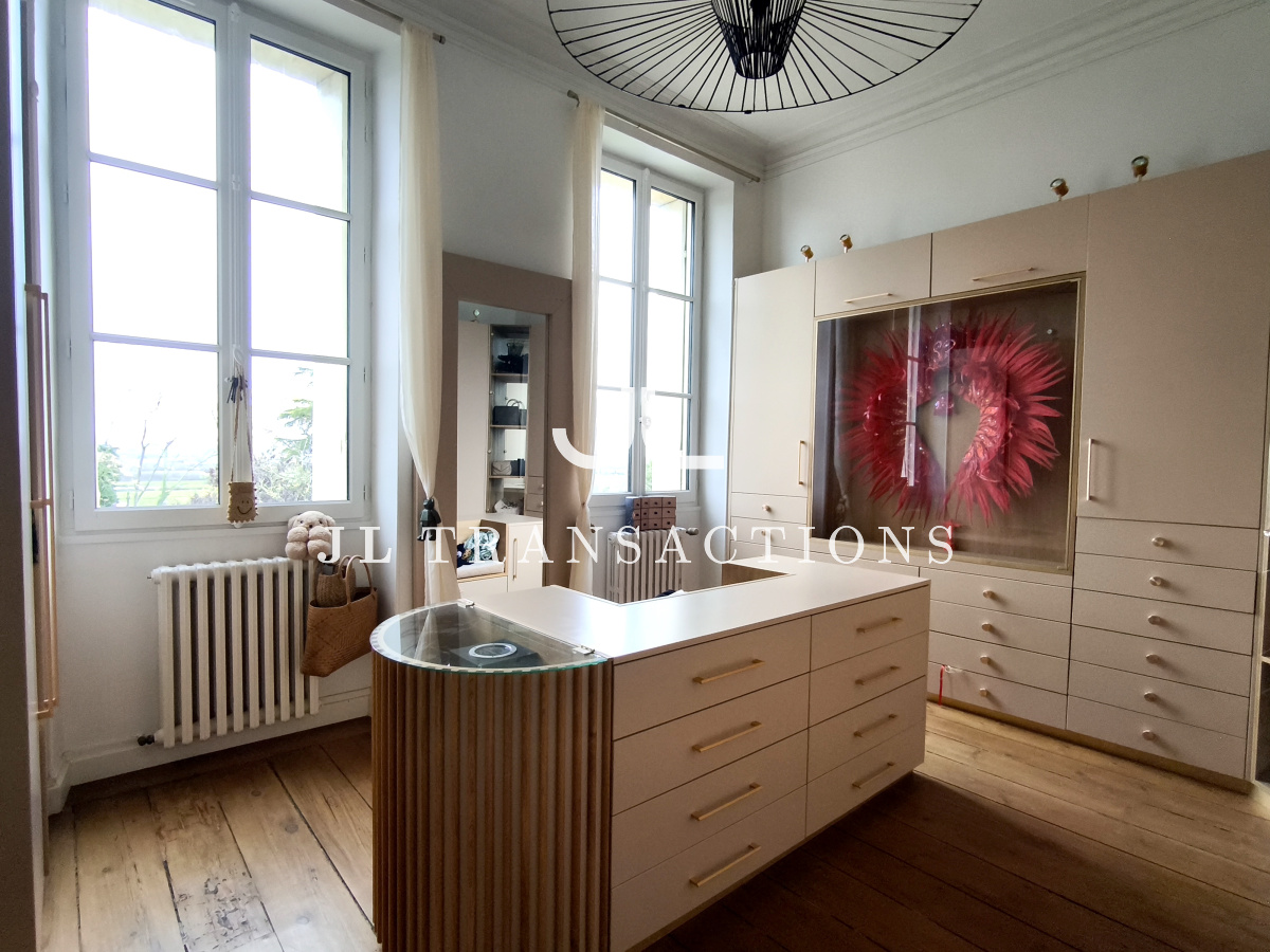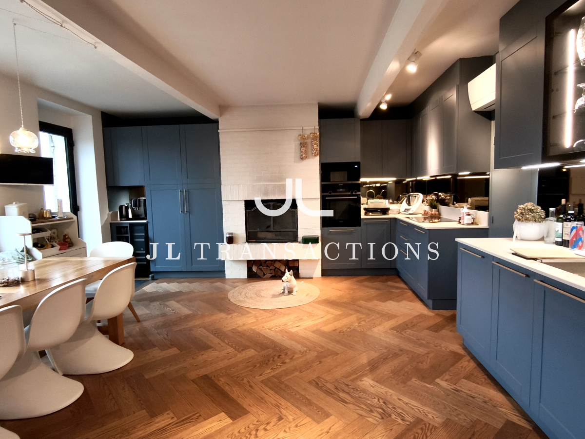 Très bien agencée et pensée pour une vie familiale et de réception, la maison offre des volumes très lumineux grâce à sa triple exposition: Est- Ouest – Sud. Elle se compose d’une double entrée, d’une pièce d’accueil / bureau, une pièce de réception de 70 m², très par lumineuse. Une vaste cuisine dînatoire de 28 m² complète l’espace de vie.