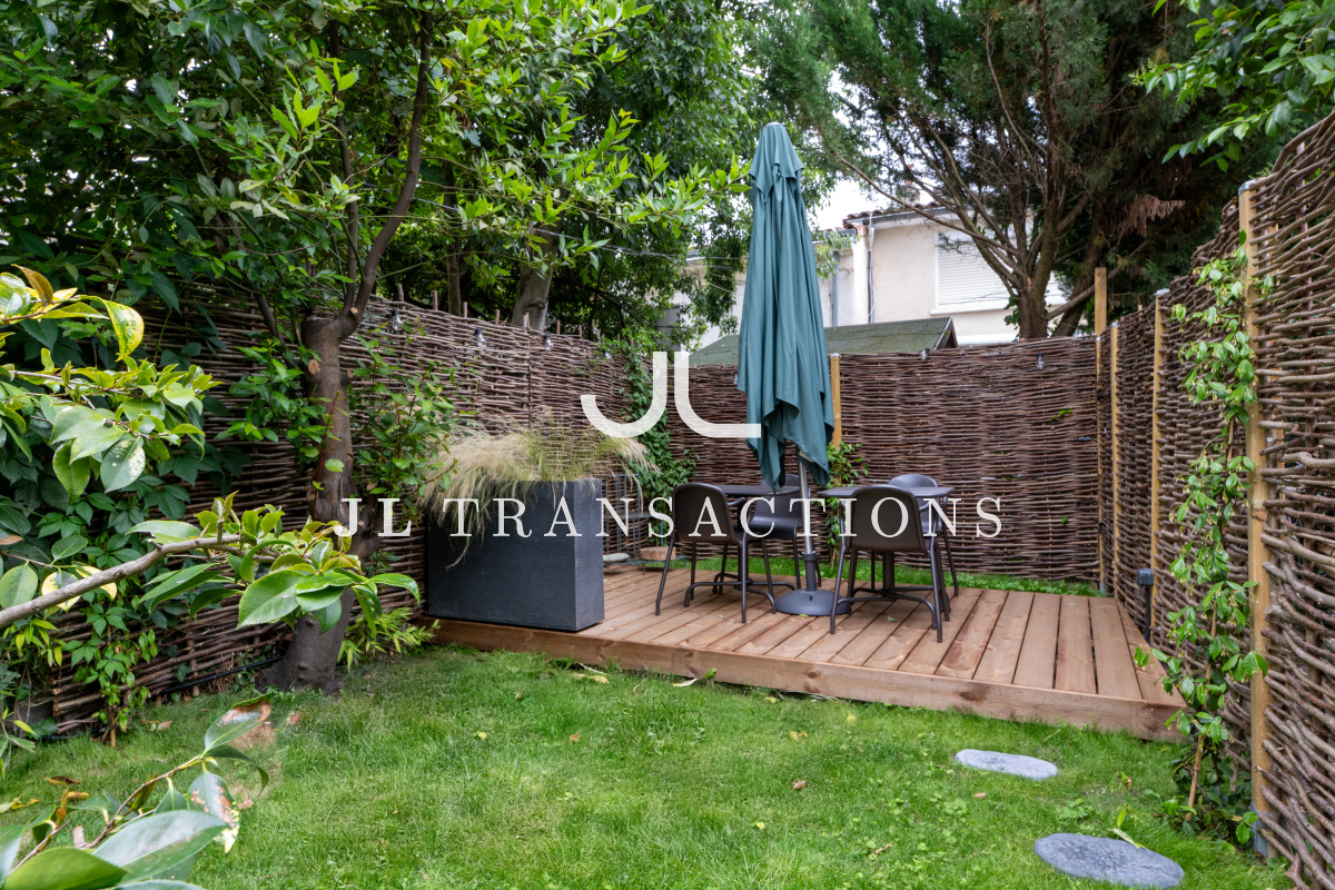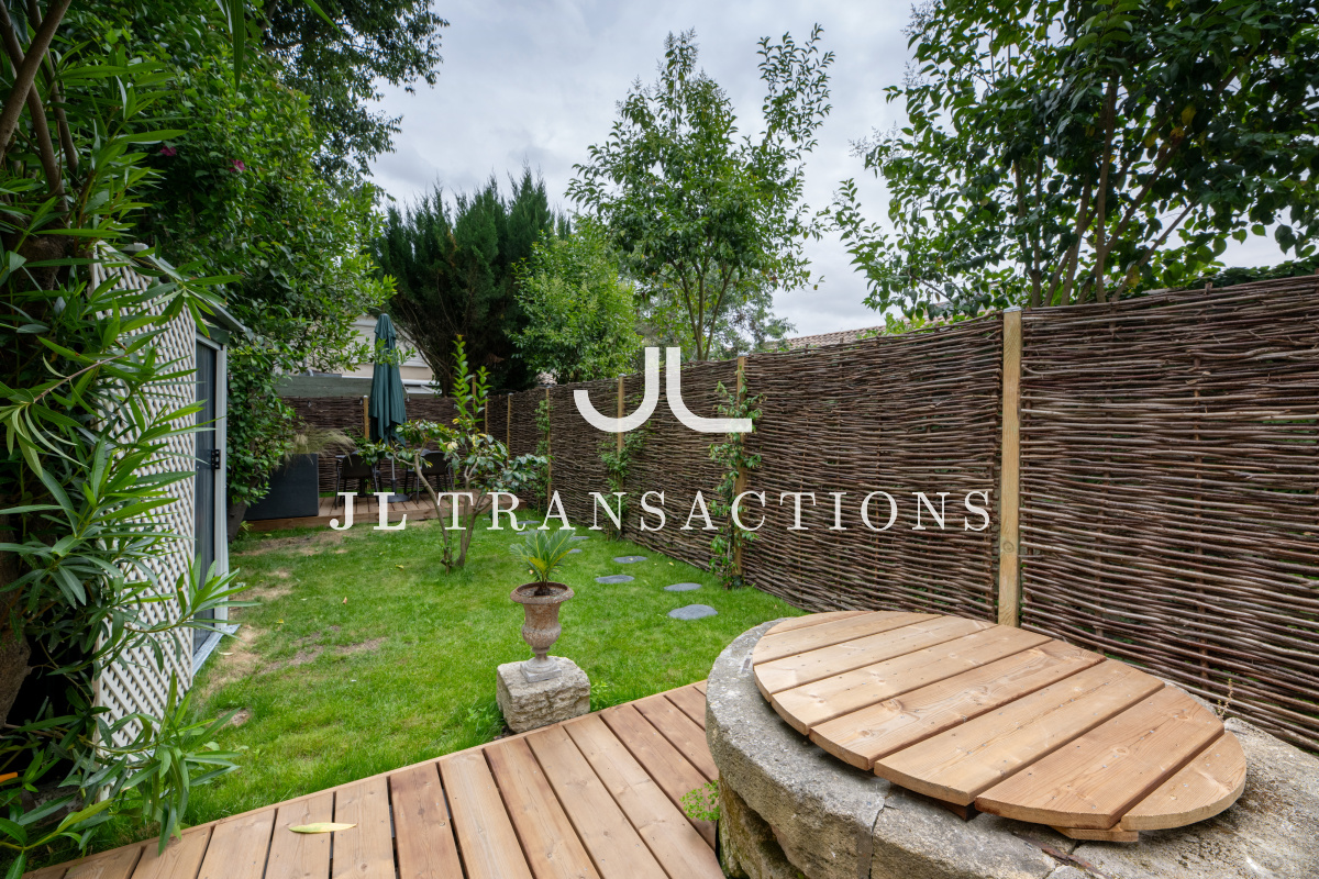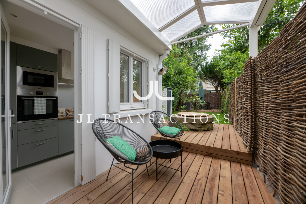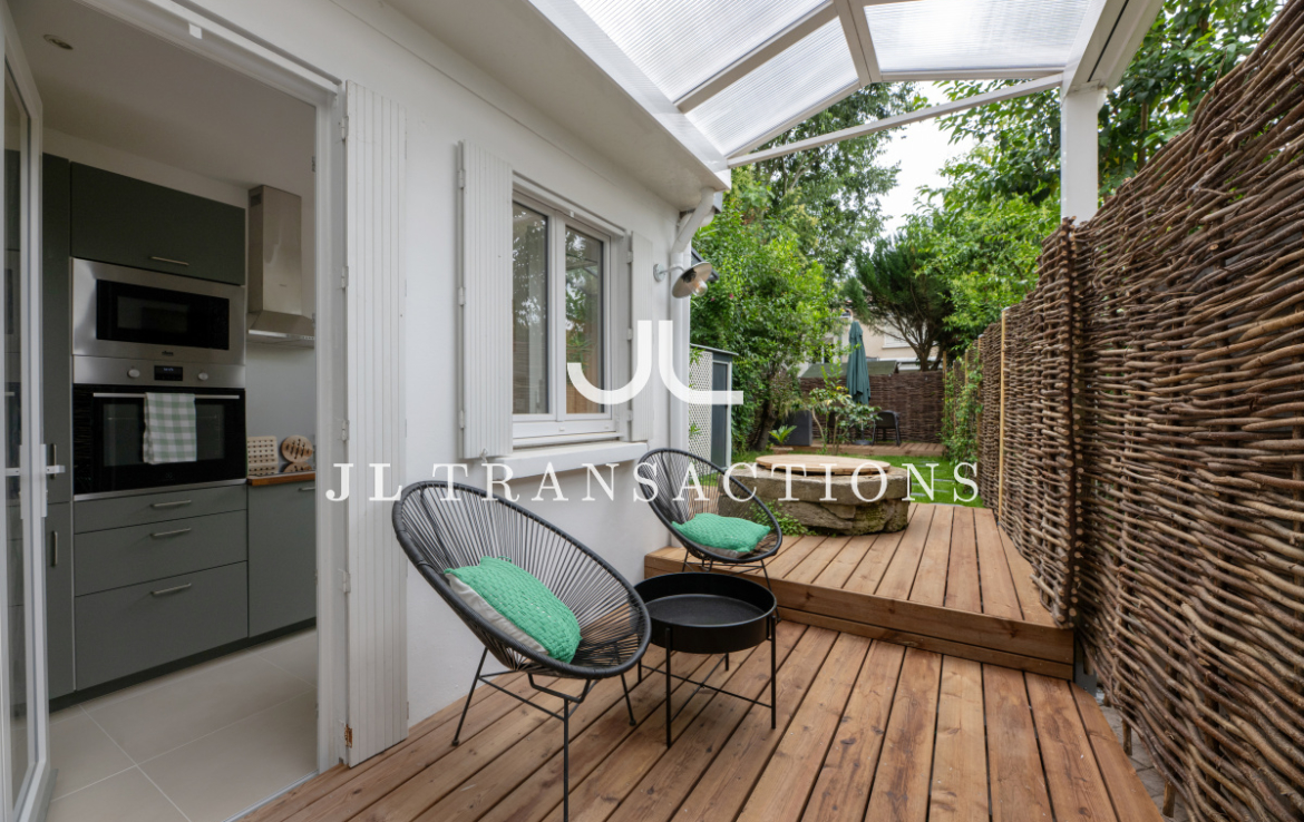 Depuis le salon et la cuisine, accédez au très agréable jardin avec sa terrasse en bois couverte.