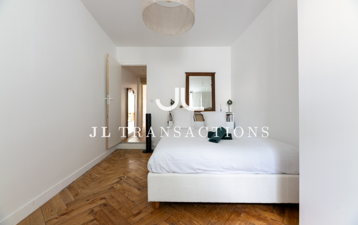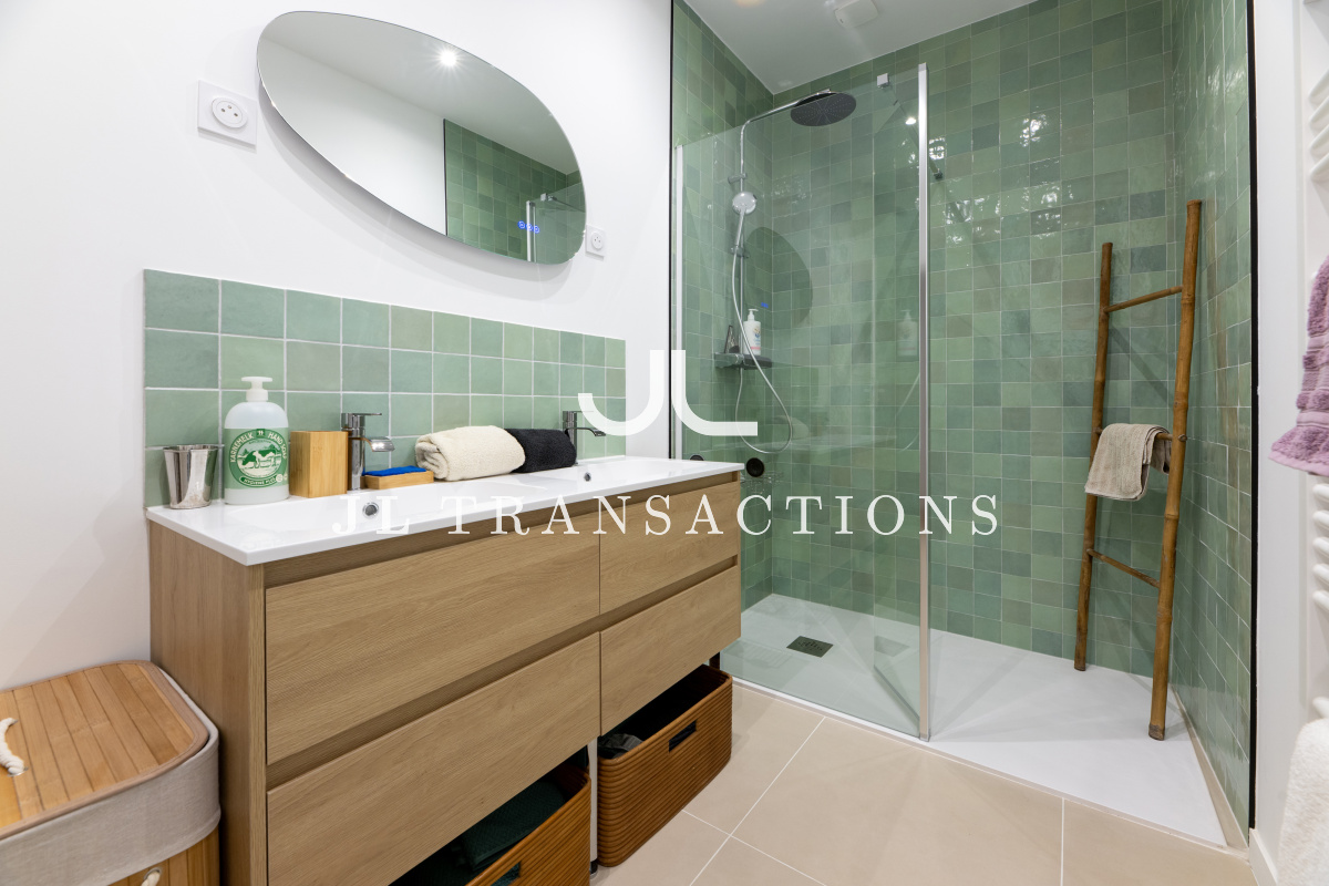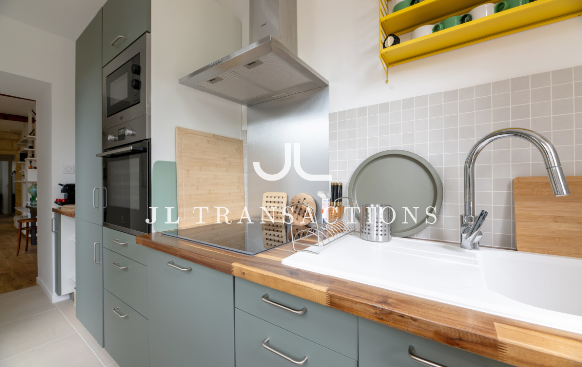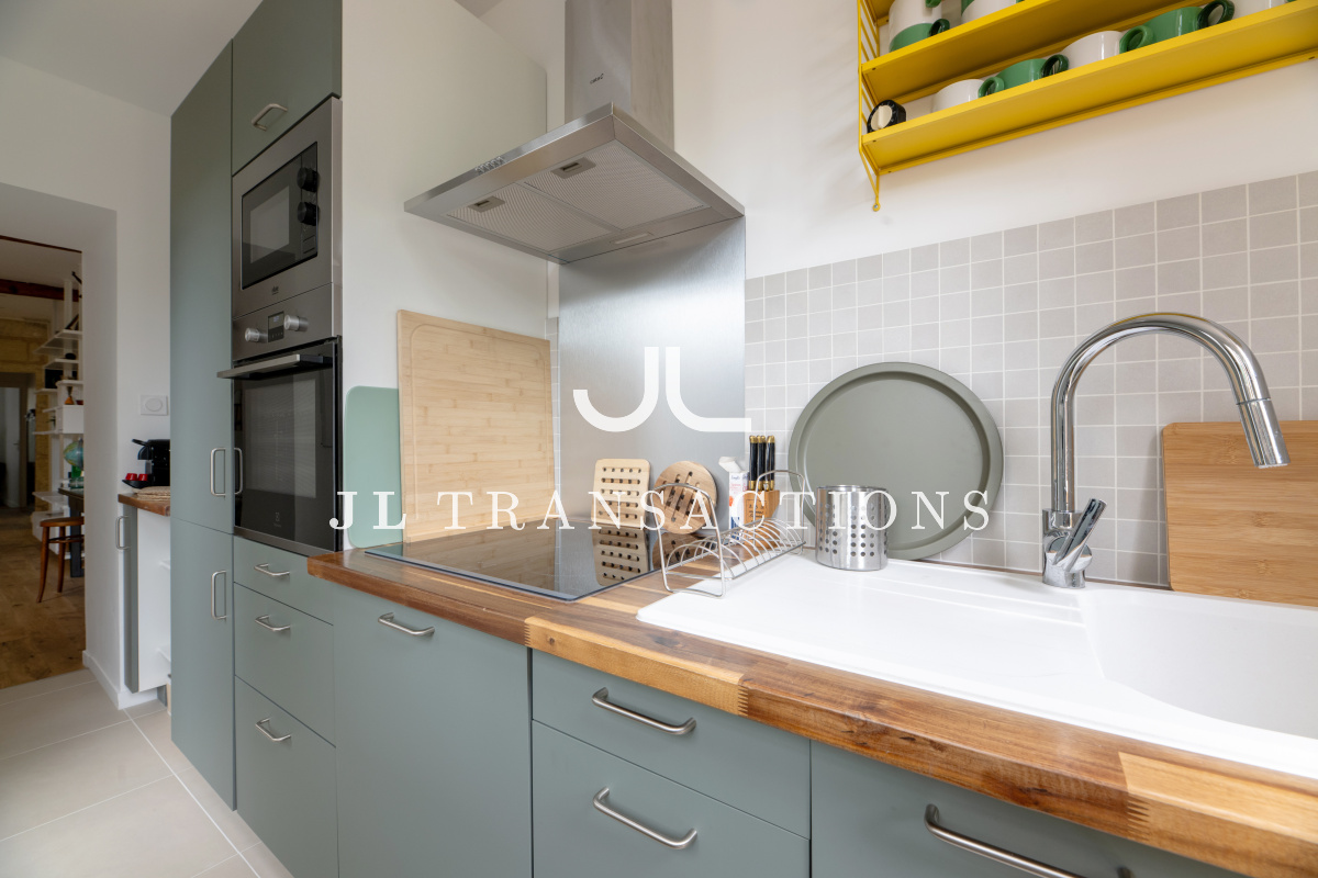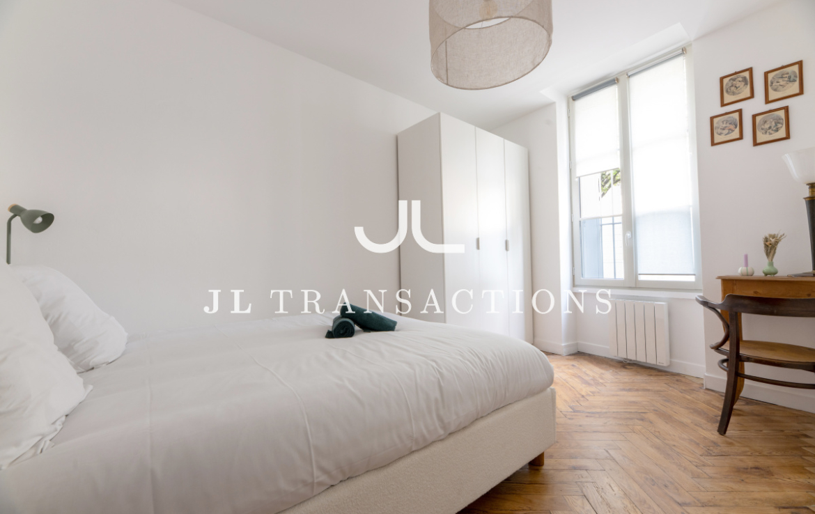 Entièrement rénové, il se compose d’une pièce de vie avec espace dînatoire, d’une cuisine séparée entièrement aménagée et équipée (four, plaques de cuisson, hotte, réfrigérateur/congélateur, lave-vaisselle), deux chambres, d’une salle d’eau (avec double vasque, machine à laver et sèche-linge) et de wc séparés.