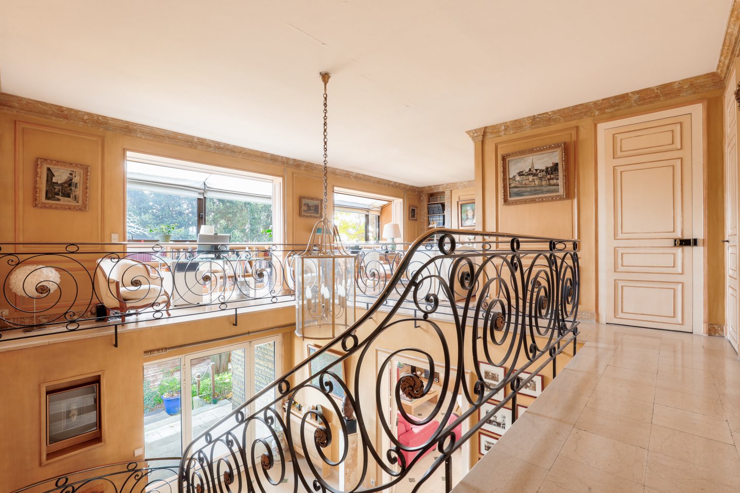 Le rez-de-chaussée s’articule autour de beaux espaces de réception: vaste hall d’entrée, un salon traversant doté d’une cheminée centrale et prolongé par une large terrasse, une salle à manger donnant également sur la terrasse et s’ouvrant sur une grande cuisine dinatoire bénéficiant d’une vue panoramique sur Paris.