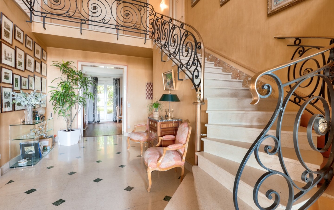 Un élégant escalier en marbre dessert les étages consacrés à la vie familiale : un grand salon-bureau bibliothèque, deux suites complètes dont une avec une salle de bains balnéo, deux chambres supplémentaires et une salle de bains avec douche et baignoire au dernier niveau. Des combles aménageables offrent un potentiel supplémentaire.