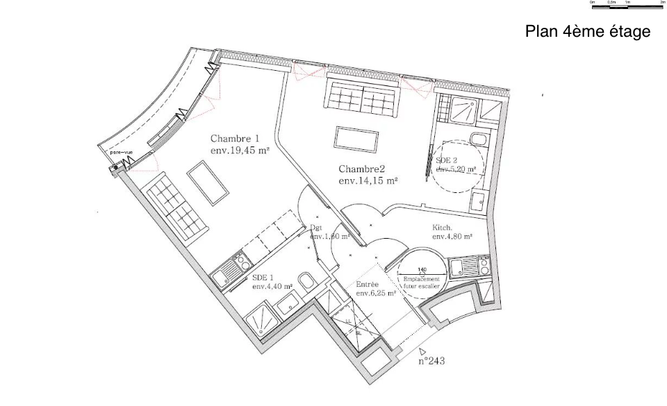 Possibilité de supprimer la cloison entre SDE 2 et Appartement  (voir plan ci-joint du 5ème étage) afin d’obtenir un grand séjour de 35 m2